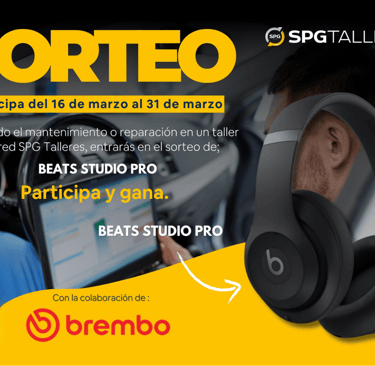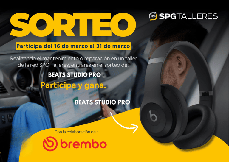 Al realizar el mantenimiento o reparación de tu vehículo en cualquier taller de la red SPG, podrás participar en el sorteo de unos auriculares Beats Studio PRO gracias a nuestro proveedor BREMBO!